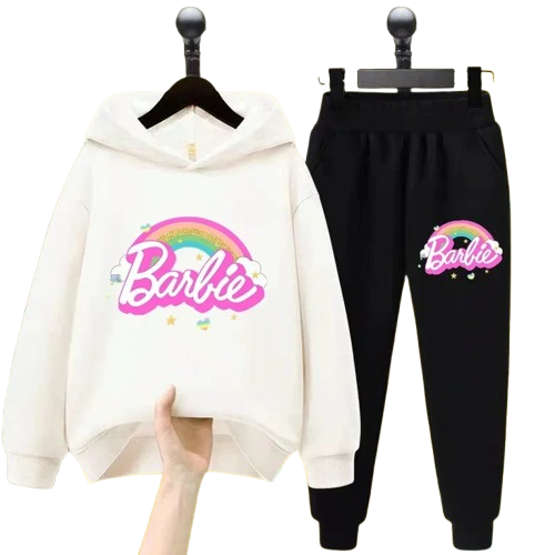 Stylowy komplet dresowy dziecięcy Barbie to idealne połączenie wygody, jakości i modnego designu. Zestaw składa się z bluzy z kapturem oraz spodni dresowych, ozdobionych nadrukiem z logiem Barbie, które pokocha każda dziewczynka. Dzięki uniwersalnemu fasonowi komplet sprawdzi się zarówno na co dzień, jak i do szkoły, przedszkola czy podczas aktywnej zabawy.