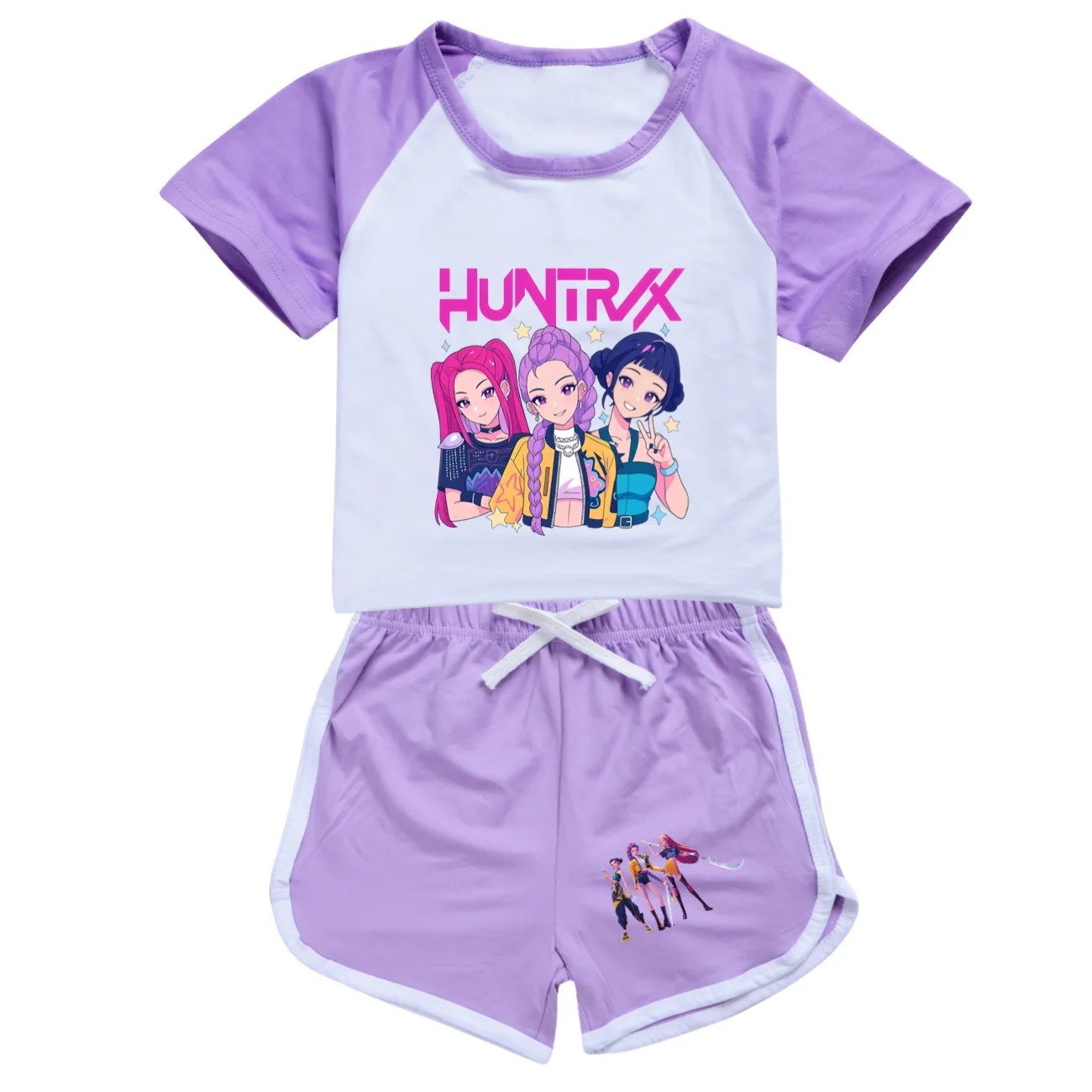 Letni Zestaw Dziecięcy K-POP HUNTRX – Koszulka i Spodenki Sportowe – Rumi, Mira, Zoey – Komplet 2-częściowy