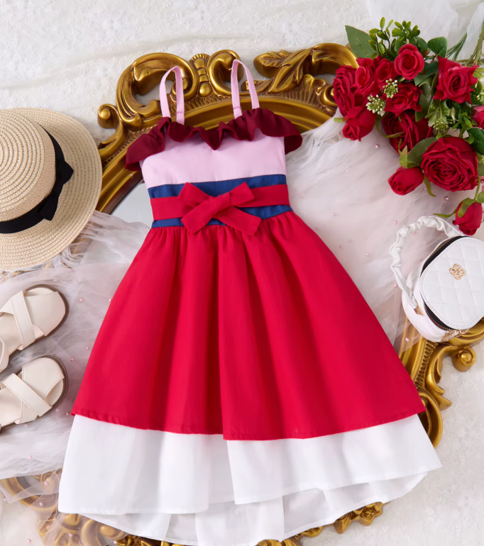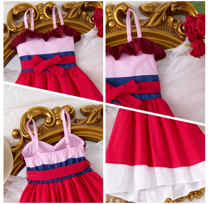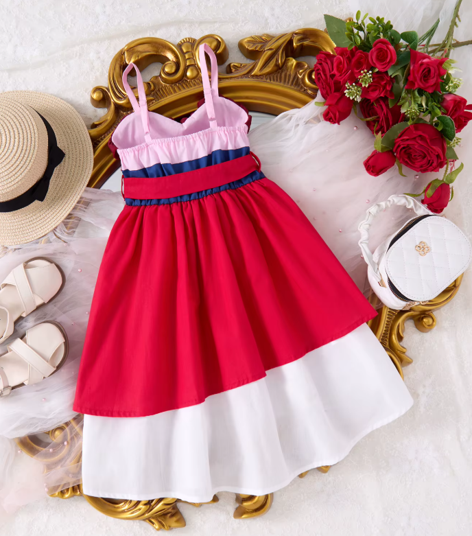Szukasz wyjątkowej kreacji na ciepłe dni? Ta wielokolorowa sukienka na ramiączkach to prawdziwy letni hit! Radosne połączenie pastelowego różu, eleganckiego granatu, intensywnej czerwieni i bieli sprawia, że sukienka przyciąga wzrok i emanuje pozytywną energią. Ozdobna falbanka przy dekolcie oraz duża, urocza kokarda w talii nadają jej niepowtarzalnego, dziewczęcego wdzięku.