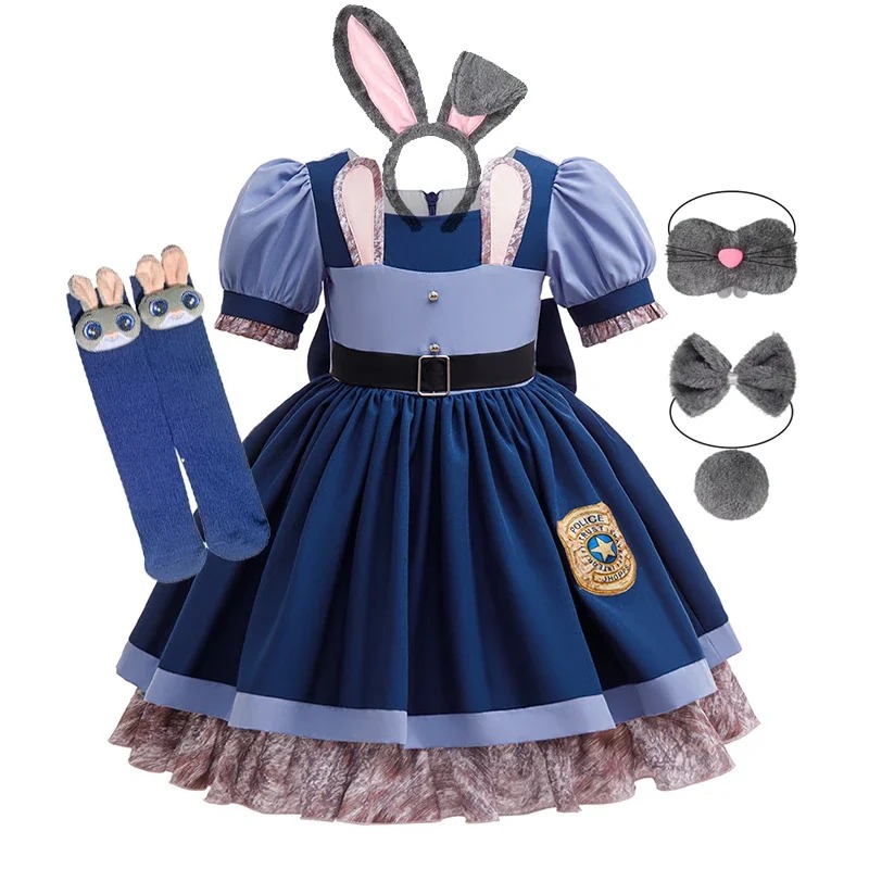 Luksusowy Zestaw Judy Hopps Zwierzogród 6w1 – Sukienka, Uszy, Maska, Mucha, Ogon i Podkolanówki