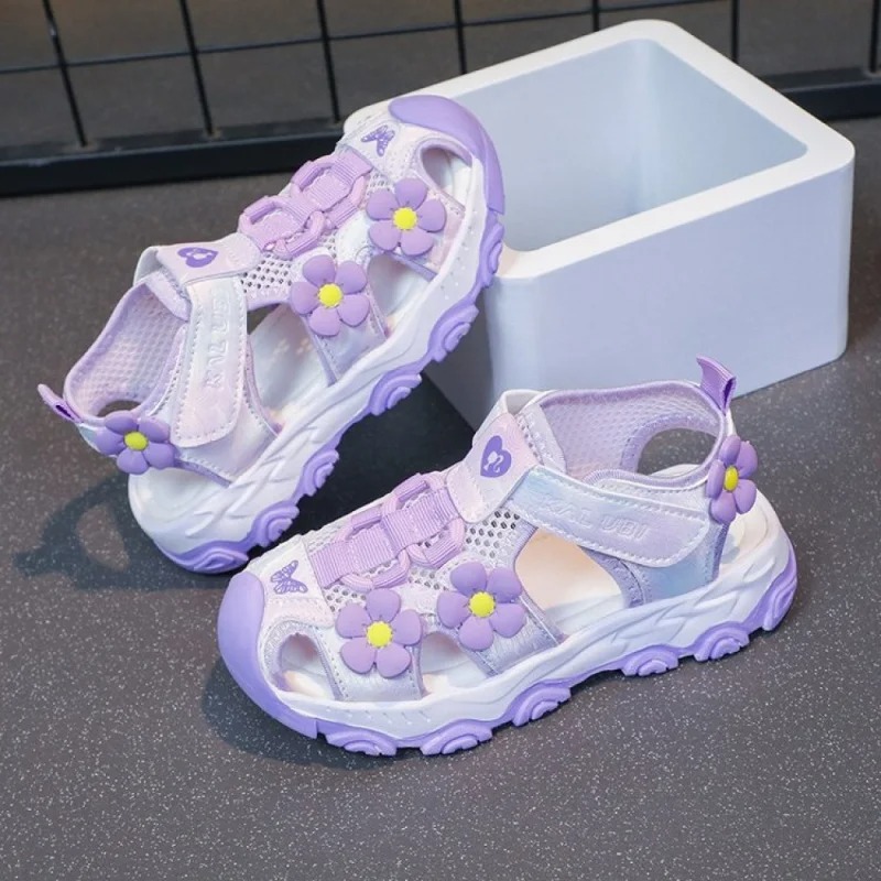 Sandały dziecięce dziewczęce fioletowe na rzep kwiatki – lekkie sandałki letnie antypoślizgowe 25–36