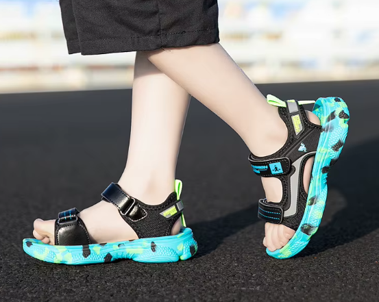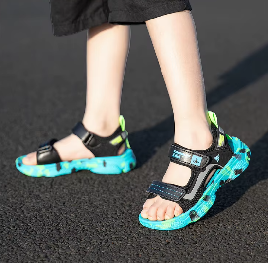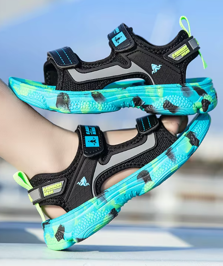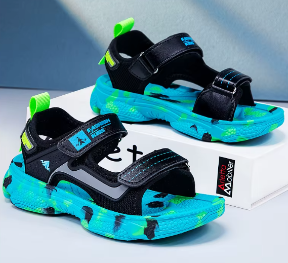 Nowoczesne sandały dziecięce o sportowym charakterze to idealny wybór dla aktywnych dzieci na sezon letni. Dynamiczne połączenie czerni z niebiesko-zieloną podeszwą nadaje butom wyjątkowy wygląd, który świetnie wpisuje się w sportowy styl.