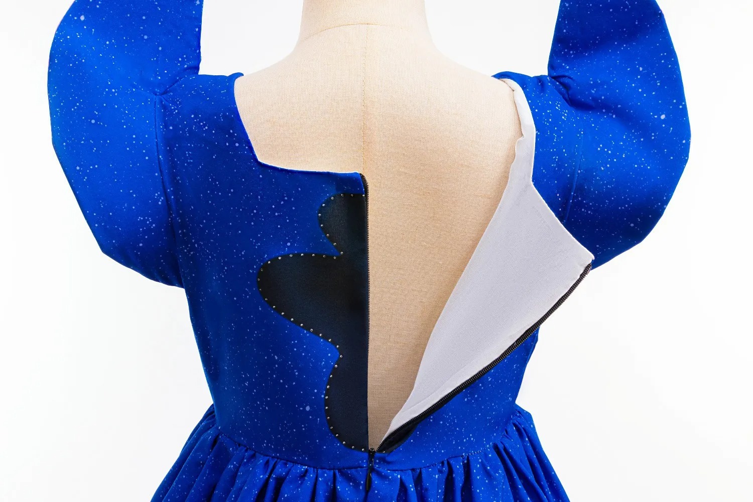 Wyjątkowy design: Sukienka w odcieniach błękitu i różu wiernie odwzorowuje postać Stitcha. Na gorsecie znajdują się wyszywane oczy i nos, a ramiona zdobią odstające, trójwymiarowe uszy.